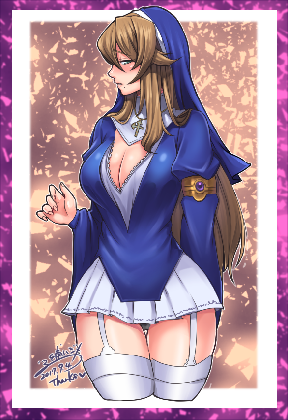1girl blush breasts brown_hair cleavage cowboy_shot cross cross_necklace female_focus garter_straps green_eyes habit jewelry large_breasts long_hair long_sleeves looking_at_viewer miura_hajime mole mole_under_mouth necklace nun nun_headdress parted_lips profile queen's_blade sigui_(queen's_blade) solo thigh_gap thighhighs thighs white_thighhighs wide_sleeves