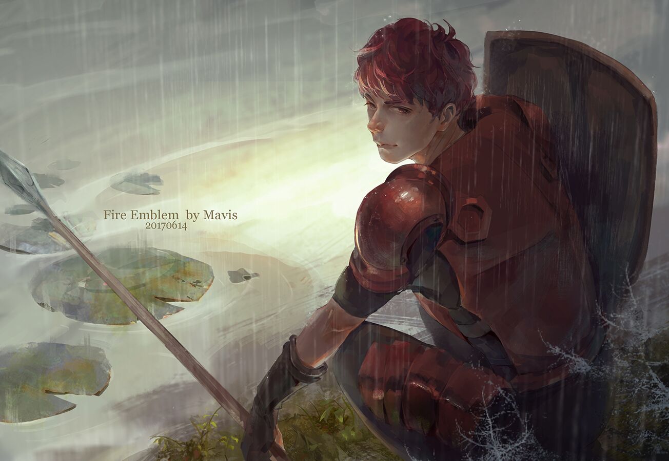 1boy artist_name back copyright_name dated fire_emblem fire_emblem_echoes:_shadows_of_valentia gloves grass leaf lily_pad lukas_(fire_emblem) male_focus mavis_fuji nintendo polearm rain red_eyes red_hair shield solo spear water weapon