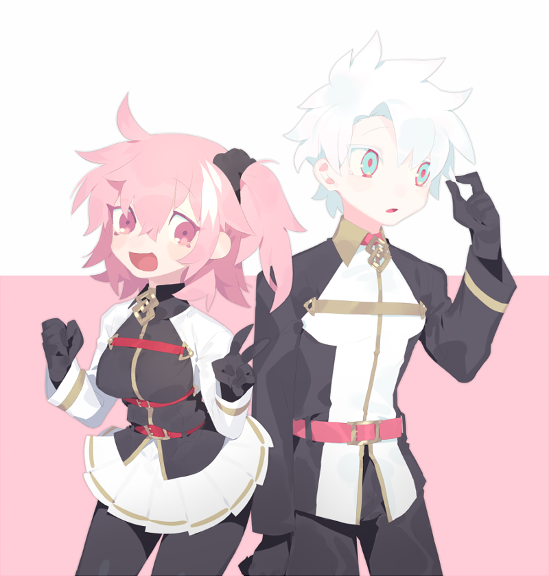 10r_(tulipano) 1boy 1girl alternate_costume astolfo_(fate) astolfo_(fate)_(cosplay) bad_id bad_twitter_id belt black_gloves blue_eyes clenched_hand cosplay cowboy_shot fate/apocrypha fate/grand_order fate_(series) fujimaru_ritsuka_(female) fujimaru_ritsuka_(male) gloves hair_intakes karna_(fate) looking_at_viewer multicolored_hair one_side_up palette_swap pink_background pink_belt pink_eyes pink_hair red_belt red_pupils scrunchie short_hair simple_background streaked_hair two-tone_background v white_background white_hair