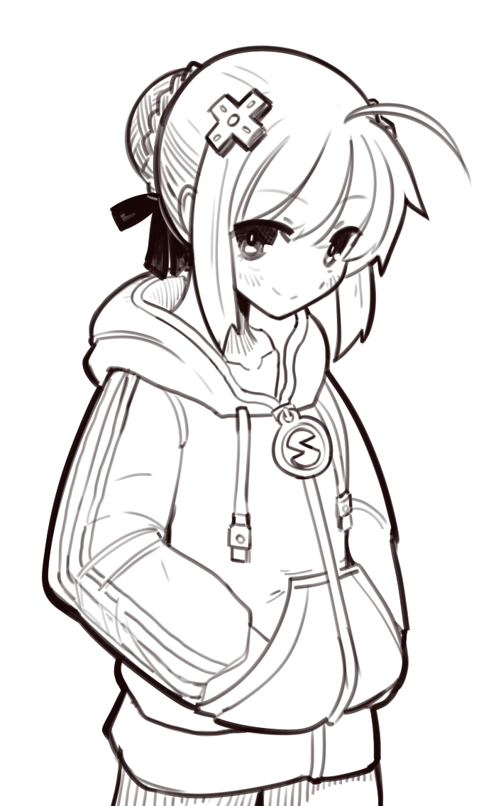 1girl ahoge artoria_pendragon_(fate) boa_(brianoa) braid brown_theme closed_mouth cosplay cowboy_shot d-pad fate/stay_night fate_(series) female_focus greyscale hair_bun hair_ornament hands_in_pockets hood hoodie long_sleeves looking_at_viewer monochrome neptune_(neptunia) neptune_(neptunia)_(cosplay) neptune_(series) pants saber_(fate) short_hair simple_background single_hair_bun smile solo standing white_background