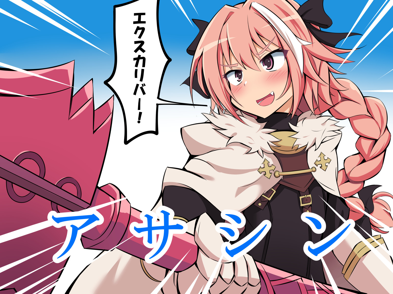 1boy androgynous astolfo_(fate) astolfo_(rider)_(fate) black_bow bow braid cape fang fate/apocrypha fate/grand_order fate_(series) gae_bolg_(fate) hair_intakes hair_ribbon highres male_focus meme mujun-gatamari_(meme) multicolored_hair neta open_mouth pink_hair polearm purple_eyes ribbon single_braid smile solo streaked_hair tagfly27qt trap weapon