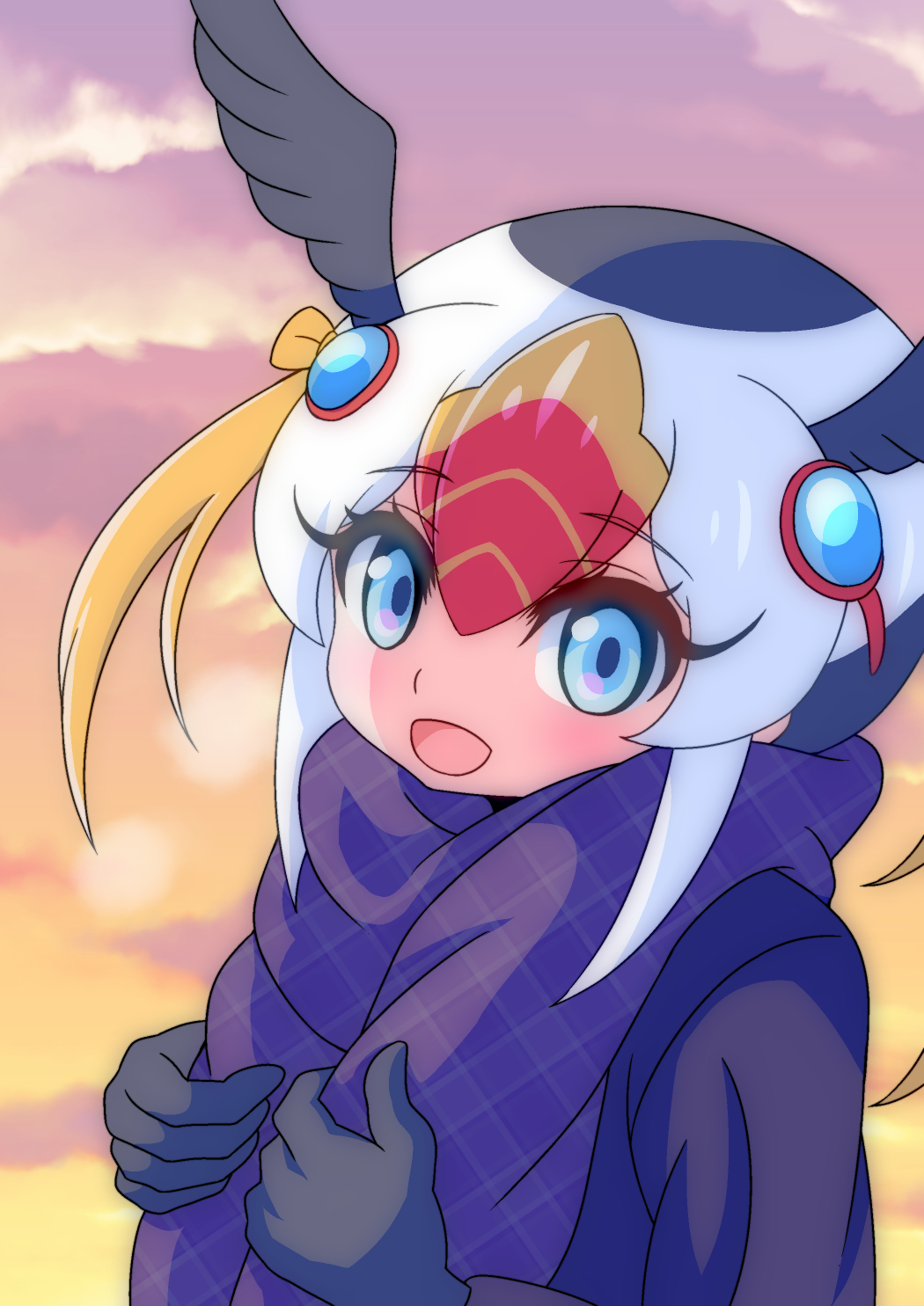 10s black_hair blonde_hair blue_eyes cloud cloudy_sky feathered_wings gloves hair_ornament hairclip head_wings highres kemono_friends mamiyama multicolored_hair open_mouth red_hair scarf sky solo tufted_puffin_(kemono_friends) upper_body white_hair wings