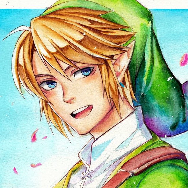 1boy :d blonde_hair blue_eyes blue_sky day earrings from_side hat jacket jewelry laovaan link looking_at_viewer male_focus nintendo open_mouth petals pointy_ears portrait shirt sky smile solo the_legend_of_zelda traditional_media