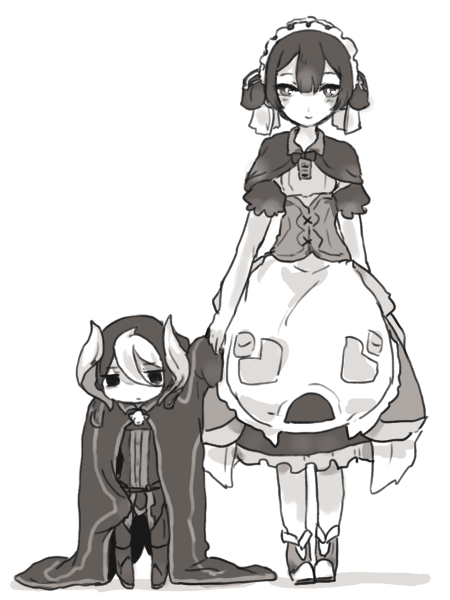 1boy 1girl aged_down aged_up apron blunt_bangs blush bustier cape capelet detached_sleeves dress greyscale hair_between_eyes height_difference jacket jitome legs_together looking_at_viewer made_in_abyss maid maid_apron maid_headdress maruruk monochrome multicolored_hair negi_(kyouki-beya) ozen pouch puffy_short_sleeves puffy_sleeves shoes short_hair short_sleeves simple_background smile standing trap two-tone_hair whistle white_background