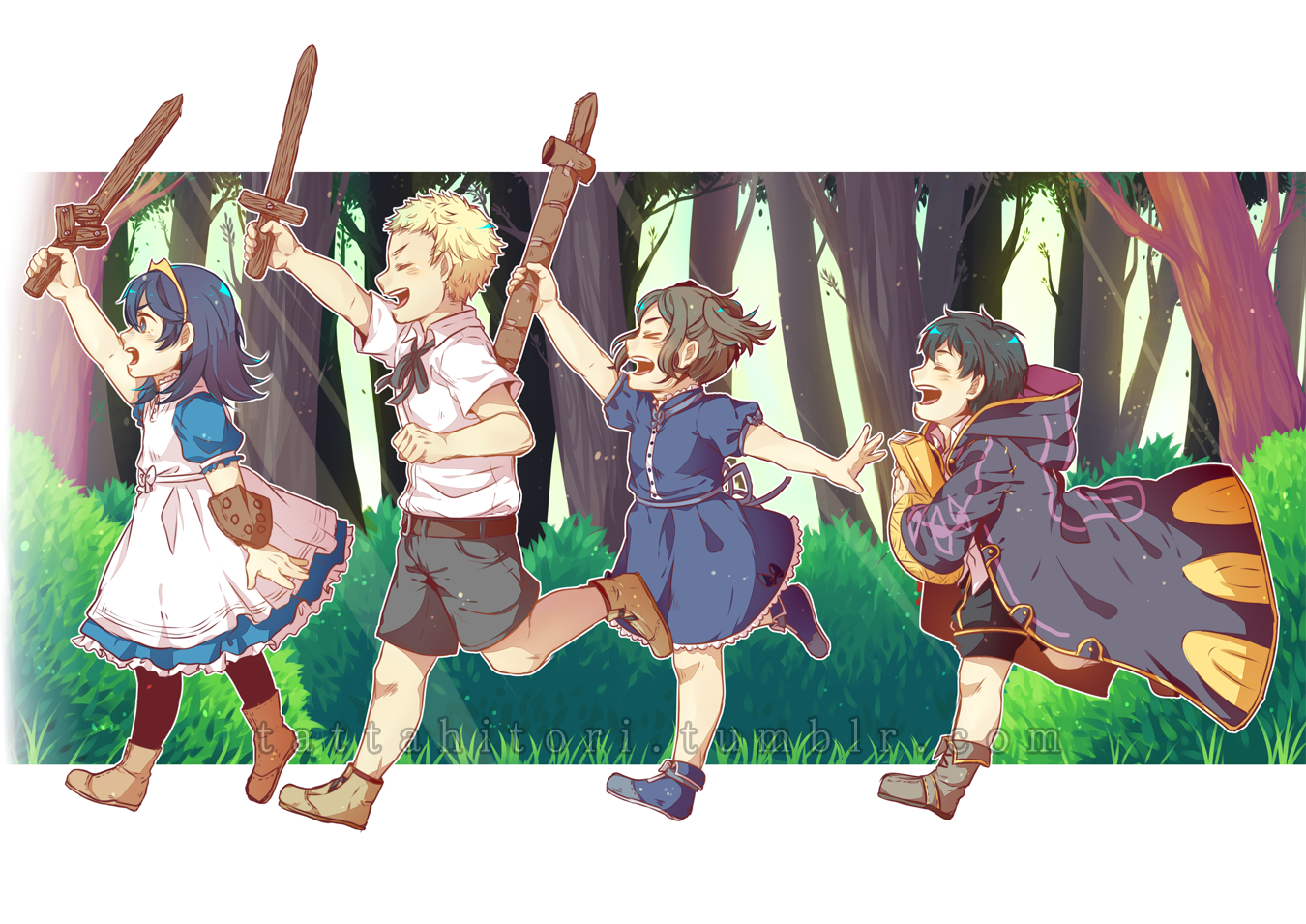 2boys 2girls black_hair blonde_hair blue_hair book child cloak closed_eyes cynthia_(fire_emblem) dress fire_emblem fire_emblem_awakening forest holding holding_book holding_sword holding_weapon lucina_(fire_emblem) male_morgan_(fire_emblem) multiple_boys multiple_girls namiine nature nintendo outdoors owain_(fire_emblem) running shorts smile sword toy tree weapon wooden_sword