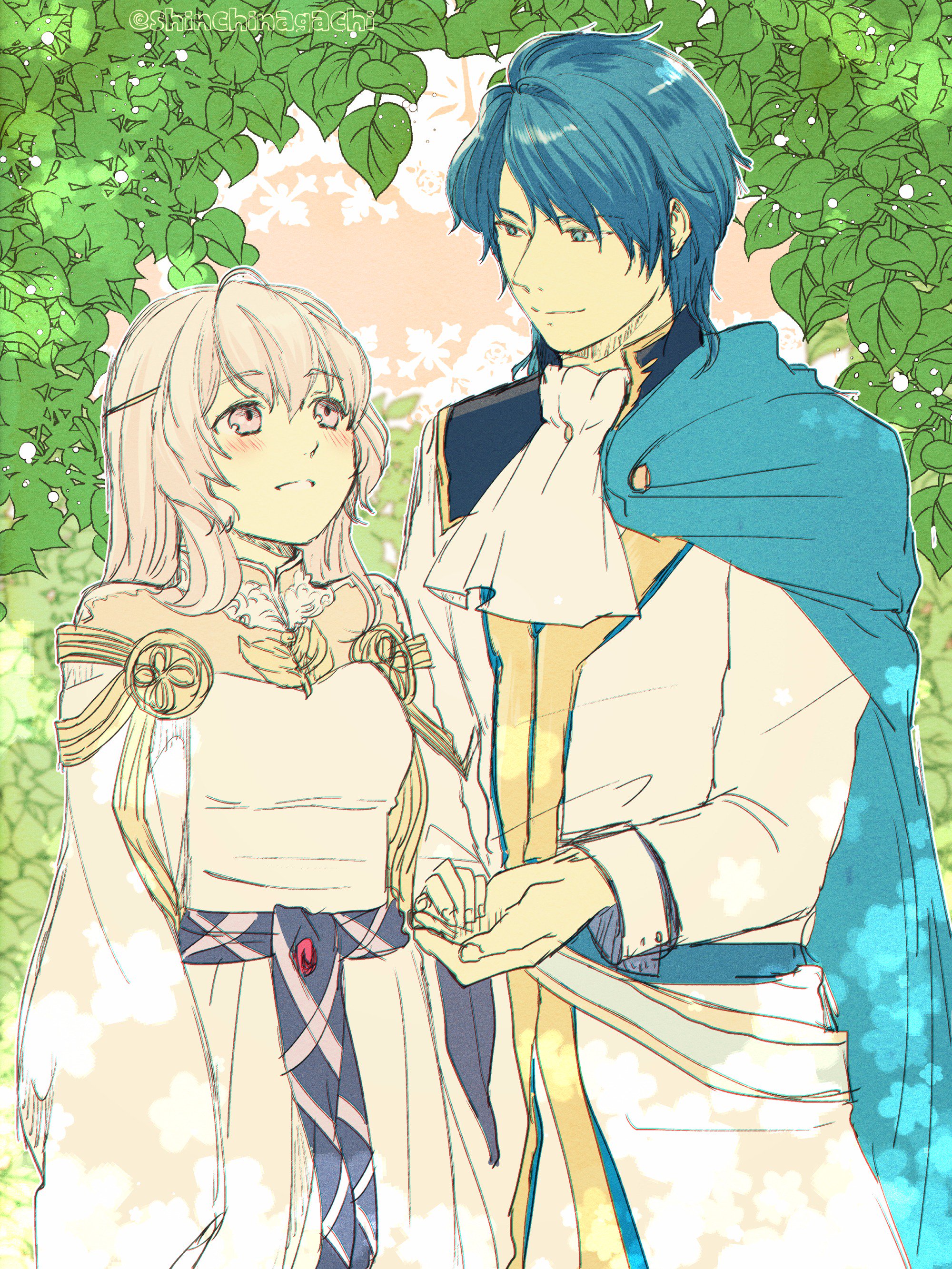 1boy 1girl absurdres blue_eyes blue_hair blush cape couple deirdre_(fire_emblem) fire_emblem fire_emblem:_genealogy_of_the_holy_war fire_emblem_heroes highres long_hair nintendo nishimura_(shinchinagachi) purple_eyes short_hair sigurd_(fire_emblem) sky smile