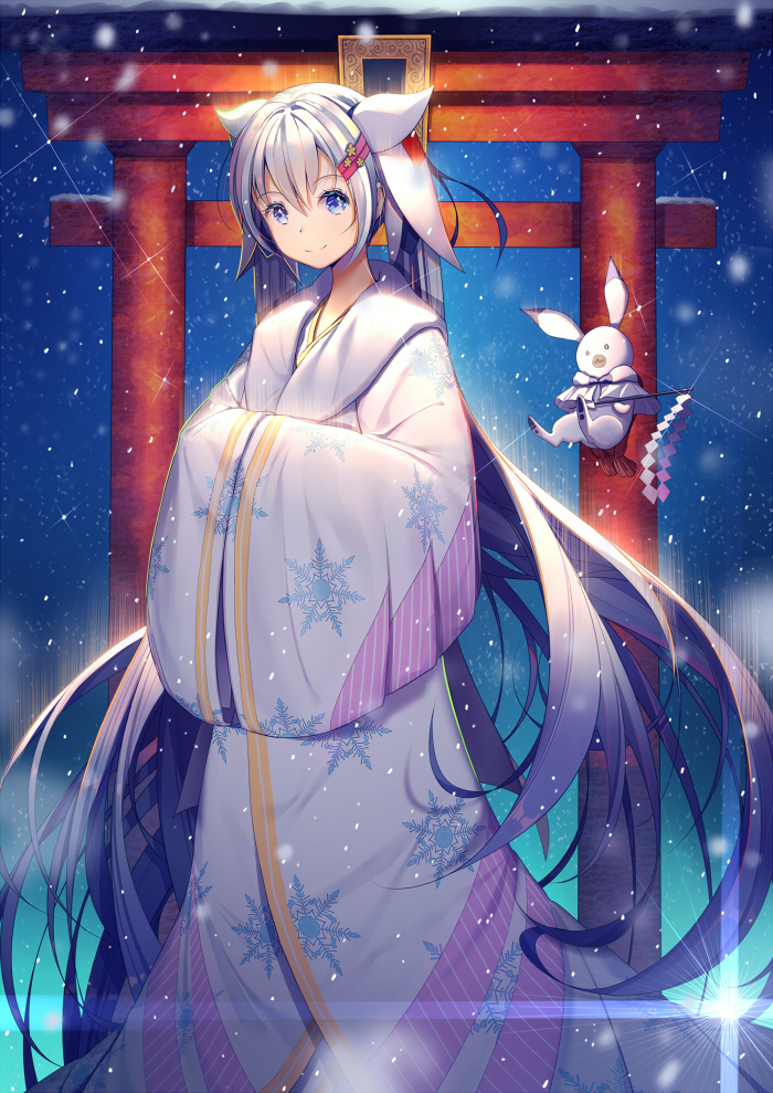 1girl blue_eyes blue_hair closed_mouth female_focus gohei hair_ornament hairclip hands_in_opposite_sleeves hatsune_miku japanese_clothes kimono light_trail long_hair long_sleeves looking_at_viewer motion_blur rabbit smile snowflake_print snowing solo standing torii twintails very_long_hair vocaloid white_kimono wide_sleeves xiaosan_ye yuki_miku yuki_miku_(2018)