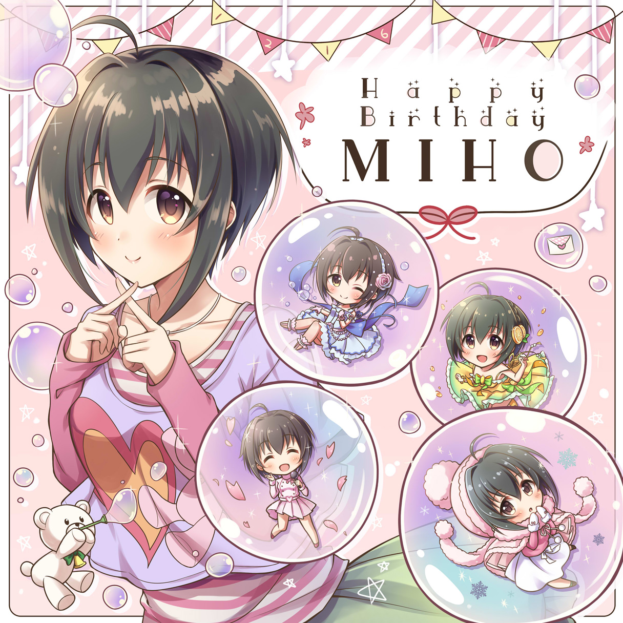 1girl :d :o ahoge alternate_costume ankle_cuffs banner bare_arms bare_shoulders bell belt black_footwear black_hair blowing_bubbles blue_bow blue_dress blush border bow braid bubble buttons capelet character_name cherry_blossoms chibi chibi_inset closed_eyes closed_mouth collarbone crossed_fingers dot_nose dress falling_petals food-themed_hair_ornament frilled_dress frilled_hairband frills fur-trimmed_capelet fur-trimmed_headwear fur_trim gem gloves green_bow green_skirt hair_intakes hair_ornament hairband hand_to_own_mouth happy_birthday hat heart heart_print hibiki_tohru highres idolmaster idolmaster_cinderella_girls in_bubble jewelry kohinata_miho layered_clothes letter long_sleeves looking_at_viewer love_letter microphone mittens multicolored_dress multiple_views music necklace one_eye_closed open_mouth orange_hair_ornament out_of_frame pearl_(gemstone) petals pink_background pink_capelet pink_hat pink_scarf pink_shirt pink_shoes pink_sweater pleated_skirt pom_pom_(clothes) purple_gloves purple_shirt scarf shadow shirt shoes short_hair singing skirt skirt_set smile snowflakes spaghetti_strap sparkle standing standing_on_one_leg star_(symbol) striped_clothes striped_shirt stuffed_animal stuffed_toy sweater teddy_bear white_mittens white_skirt winter_clothes x_fingers yellow_dress yellow_eyes