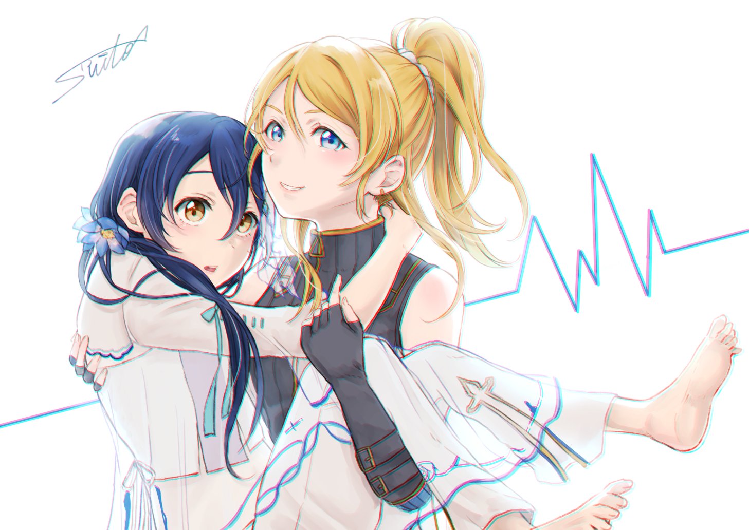 2girls ao_dai ayase_eli barefoot black_gloves blonde_hair blue_eyes blue_hair blush carrying feet fingerless_gloves flower gloves hair_between_eyes hair_flower hair_ornament long_hair love_live! love_live!_school_idol_festival love_live!_school_idol_project multiple_girls open_mouth ponytail princess_carry scrunchie signature simple_background sleeveless smile sonoda_umi suito toes white_background yellow_eyes yuri