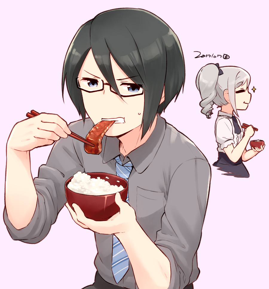 10s 1boy 1girl ascot black_hair black_neckwear black_pants black_skirt blouse blue_eyes blue_neckwear bowl breast_pocket chewing chopsticks closed_eyes closed_mouth collared_shirt dated diagonal-striped_clothes diagonal-striped_necktie dress_shirt eating frilled_shirt frills glasses gothic_lolita grey_shirt hair_between_eyes high-waist_skirt holding holding_bowl holding_chopsticks idolmaster idolmaster_cinderella_girls idolmaster_side-m kanzaki_ranko lolita_fashion medium_hair nagian necktie pants pocket pork puffy_short_sleeves puffy_sleeves purple_background rice rice_bowl sakuraba_kaoru semi-rimless_eyewear shirt shirt_pocket short_sleeves silver_hair simple_background skirt smile sparkle striped_clothes striped_necktie striped_neckwear sweatdrop twintails uchida_maaya uchida_yuuma under-rim_eyewear upper_body v-shaped_eyebrows voice_actor_connection white_background white_shirt