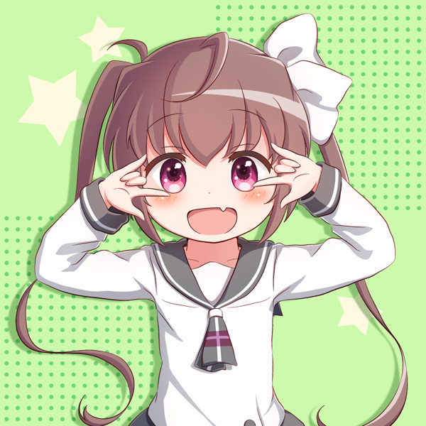 10s 1girl :d ahoge blush bow brown_hair collarbone commentary_request double_m/ fang female_focus goth_risuto green_background grey_neckwear grey_skirt hair_between_eyes hair_bow long_hair long_sleeves m/ momochi_tamate open_mouth polka_dot polka_dot_background purple_eyes school_uniform serafuku shirt skirt slow_start smile solo star_(symbol) star_symbol_background twintails very_long_hair white_bow white_shirt