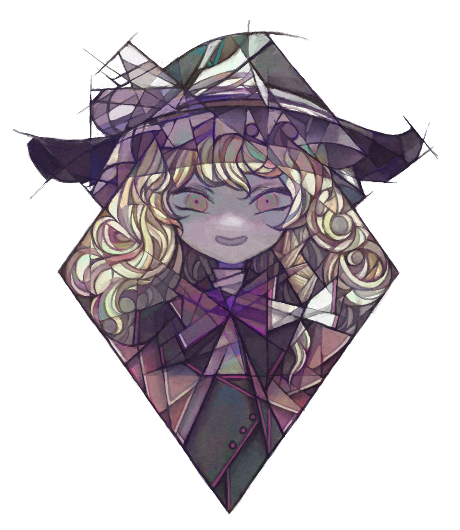 1girl abstract ashitano_kirin blonde_hair bow close-up diamond_(shape) female_focus hat hat_bow highres kirisame_marisa long_hair portrait purple_bow smile solo touhou white_bow witch_hat