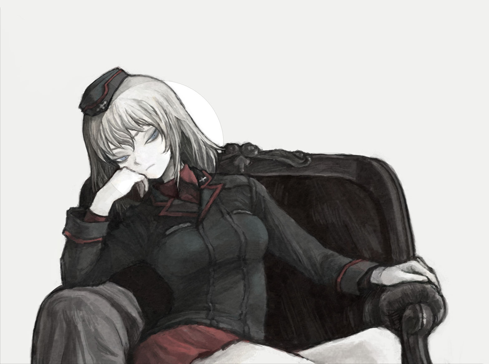 10s 1girl arm_rest armchair ashitano_kirin black_hat black_jacket blue_eyes breasts chair circle closed_mouth crossed_legs female_focus frown garrison_cap girls_und_panzer hair_between_eyes hat head_on_hand itsumi_erika jacket kuromorimine_military_uniform limited_palette long_hair long_sleeves medium_breasts military military_hat military_uniform muted_color red_shirt red_skirt serious shirt silver_hair simple_background sitting skirt solo
