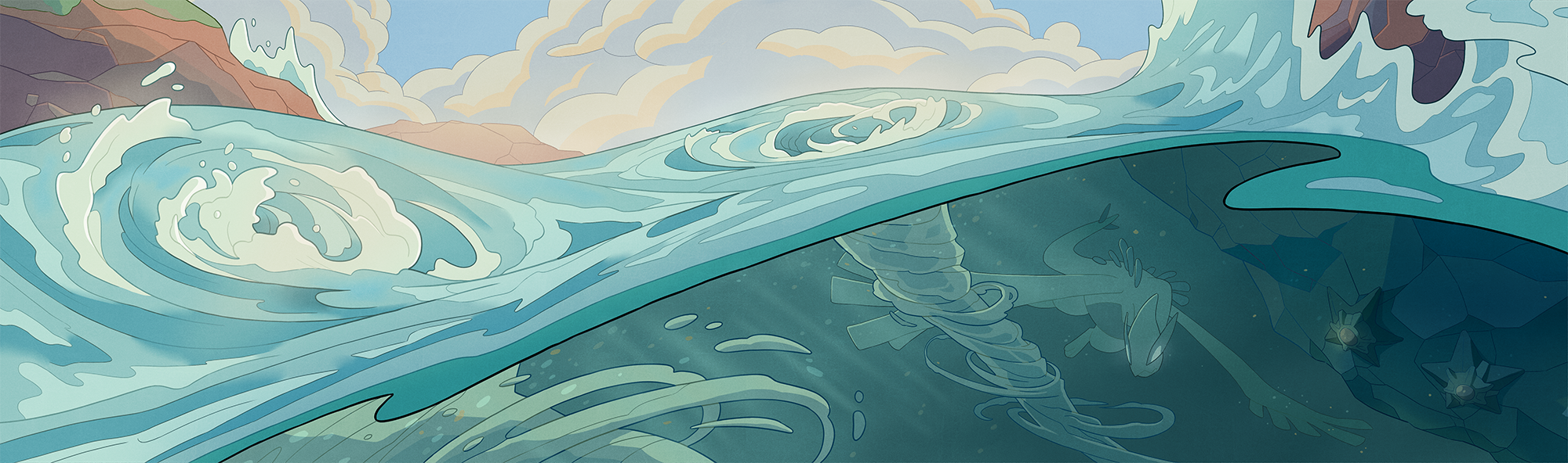 blue_sky cloud gen_1_pokemon gen_2_pokemon glowing glowing_eyes highres jamie_loughran legendary_pokemon lugia nintendo no_humans ocean pokemon pokemon_(creature) pokemon_gold/silver/crystal rock scenery sky staryu underwater waves whirlpool