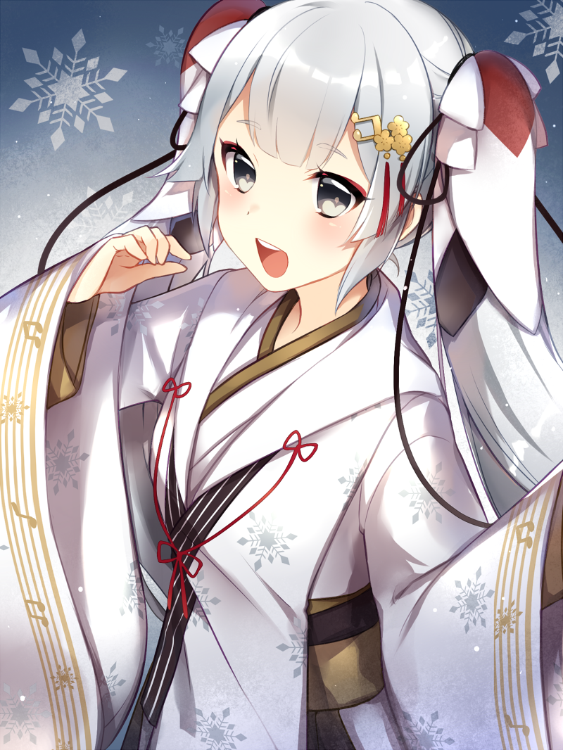 1girl :d beamed_quavers blush commentary_request female_focus fortissimo grey_eyes hair_ornament hand_up hatsune_miku japanese_clothes leafwow long_hair long_sleeves looking_at_viewer miko musical_note musical_note_hair_ornament obi open_mouth sash sidelocks silver_hair smile solo teeth upper_teeth_only very_long_hair vocaloid wide_sleeves yuki_miku