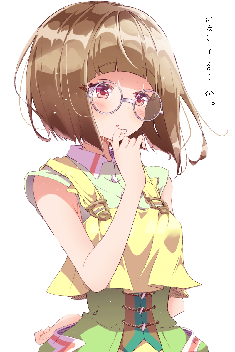 10s 1girl :o arm_behind_back blush brown_hair crop_top dress erica_brown female_focus glasses highres ichijo_rei looking_at_viewer red_eyes short_hair simple_background sleeveless sleeveless_dress solo upper_body violet_evergarden_(series) white_background wind