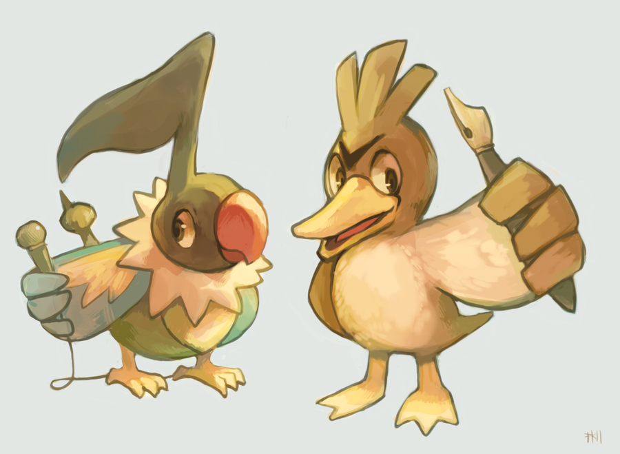 animal_focus bird brown_eyes cable chatot commentary farfetch'd full_body gen_1_pokemon gen_4_pokemon glitchedpuppet grey_background holding holding_microphone holding_pen looking_at_viewer microphone nintendo no_humans pen pokemon pokemon_(creature) pokemon_mystery_dungeon simple_background