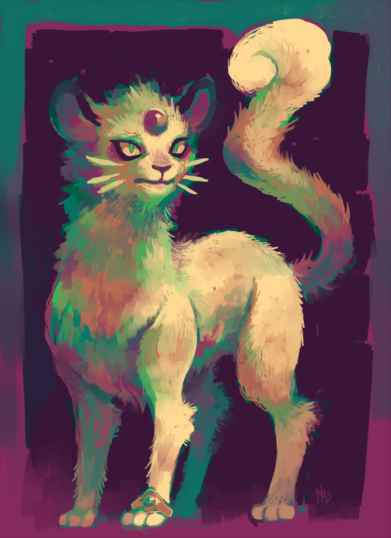 bracelet fluffy full_body gen_1_pokemon glitchedpuppet green_eyes jewelry looking_at_viewer nintendo no_humans persian_(pokemon) pokemon pokemon_(creature) pokemon_focus pokemon_rgby purple_background serious signature solo standing whiskers