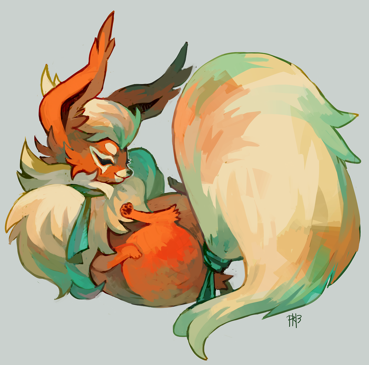 closed_eyes facial_mark flareon full_body gen_1_pokemon glitchedpuppet grey_background highres lying neck_ribbon nintendo no_humans on_back pokemon pokemon_(creature) pokemon_focus pokemon_rgby ribbon signature simple_background solo tail tail_ornament tail_ribbon