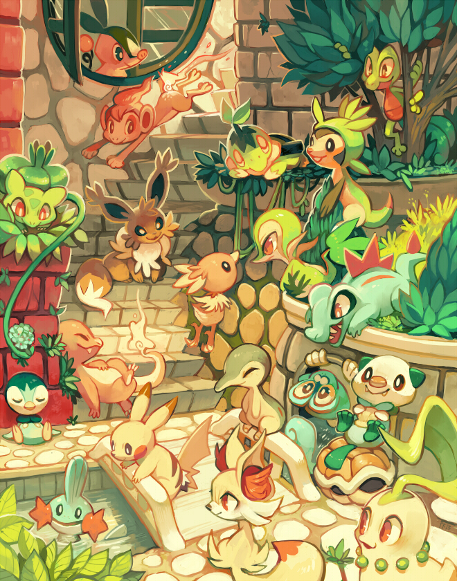 black_eyes blush_stickers brick_wall bridge bulbasaur charmander chespin chikorita chimchar closed_eyes commentary creature cyndaquil eevee fennekin fiery_tail fire flame-tipped_tail floor froakie gen_1_pokemon gen_2_pokemon gen_3_pokemon gen_4_pokemon gen_5_pokemon gen_6_pokemon glitchedpuppet grass leaf monkey mudkip nintendo no_humans open_window orange_eyes oshawott pikachu piplup plant pokemon pokemon_(creature) pokemon_bw pokemon_dppt pokemon_gsc pokemon_rgby pokemon_rse pokemon_xy red_eyes running sitting sleeping snivy squirtle stairs standing starter_pokemon_trio swimming tail tepig torchic totodile treecko turtle_shell turtwig vines window