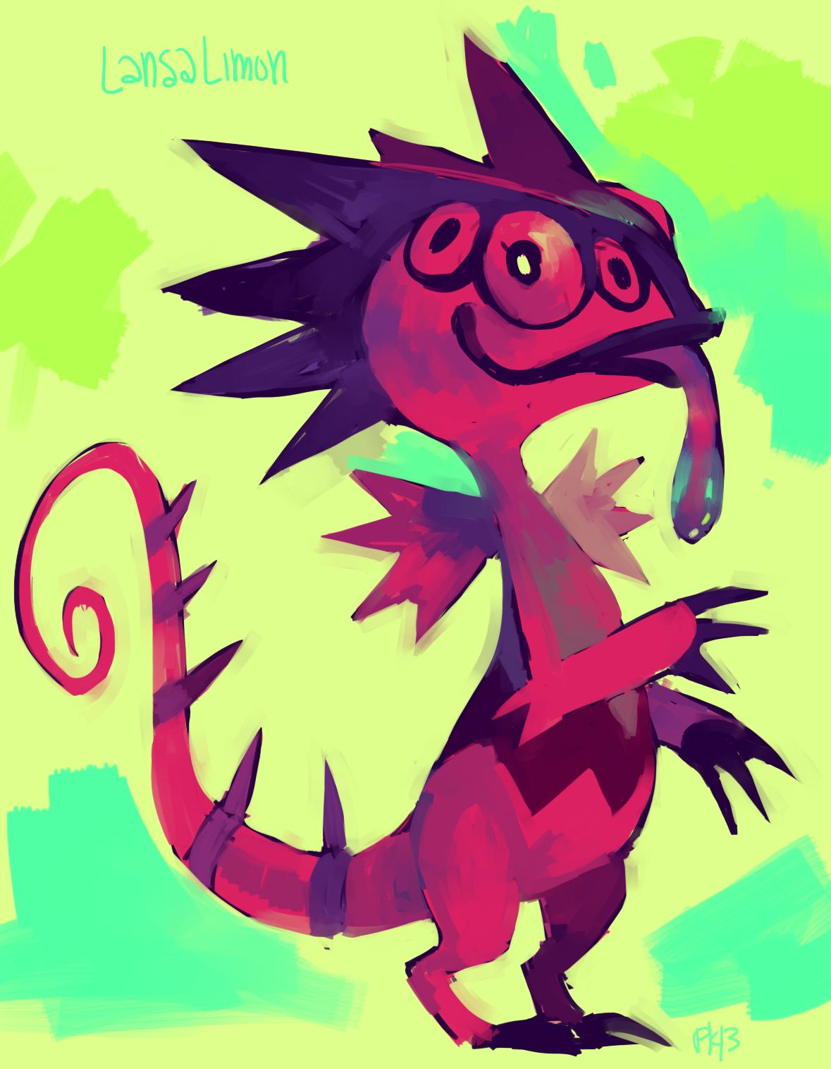 alternate_color alternate_shiny_pokemon character_name colored_skin commentary eyelashes full_body gen_3_pokemon glitchedpuppet green_background high_contrast highres kecleon nintendo no_humans pink_skin pokemon pokemon_(creature) pokemon_rse purple_kecleon signature solo standing tongue tongue_out