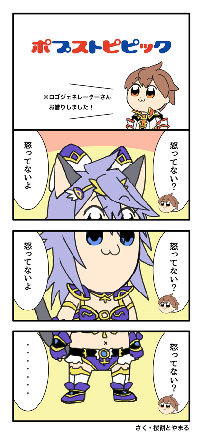 10s 2boys 4koma :3 animal_ears armor bikini_armor bkub_(style) blue_eyes blue_hair brown_eyes brown_hair cat_boy cat_ears cat_tail comic crossdressing crossdressing_(mtf) ledo_vassar light_blue_hair male_focus multiple_boys parody pop-up_story poptepipic portmanteau selim_spark smile style_parody tail toyamaru_(sakurairo_palette) translation_request