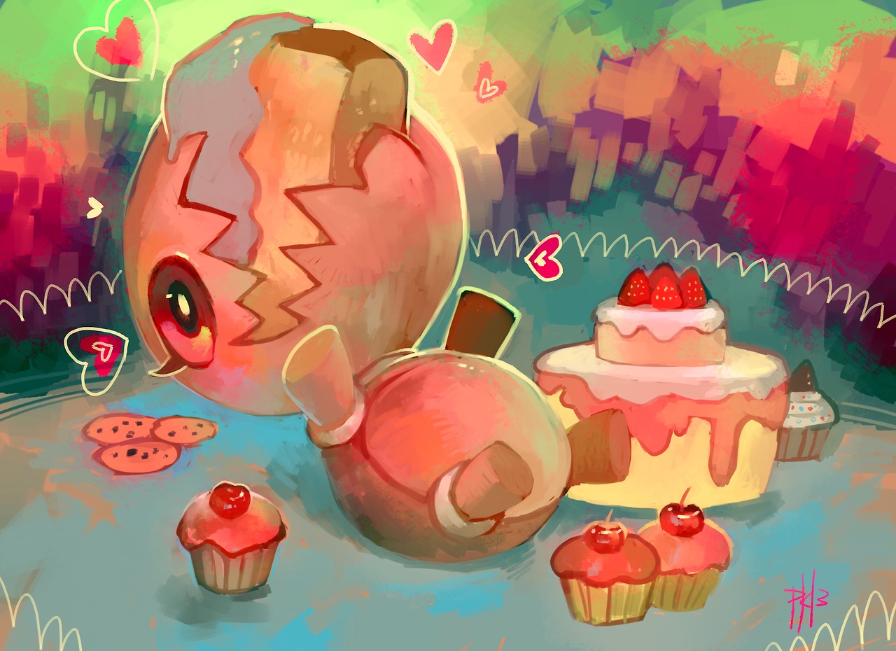 cake commission cookie cupcake eating eyelashes food food_focus fruit full_body gen_3_pokemon glitchedpuppet happy heart lying multicolored_background nintendo no_humans on_back pokemon pokemon_(creature) pokemon_focus pokemon_rse signature solo strawberry trapinch