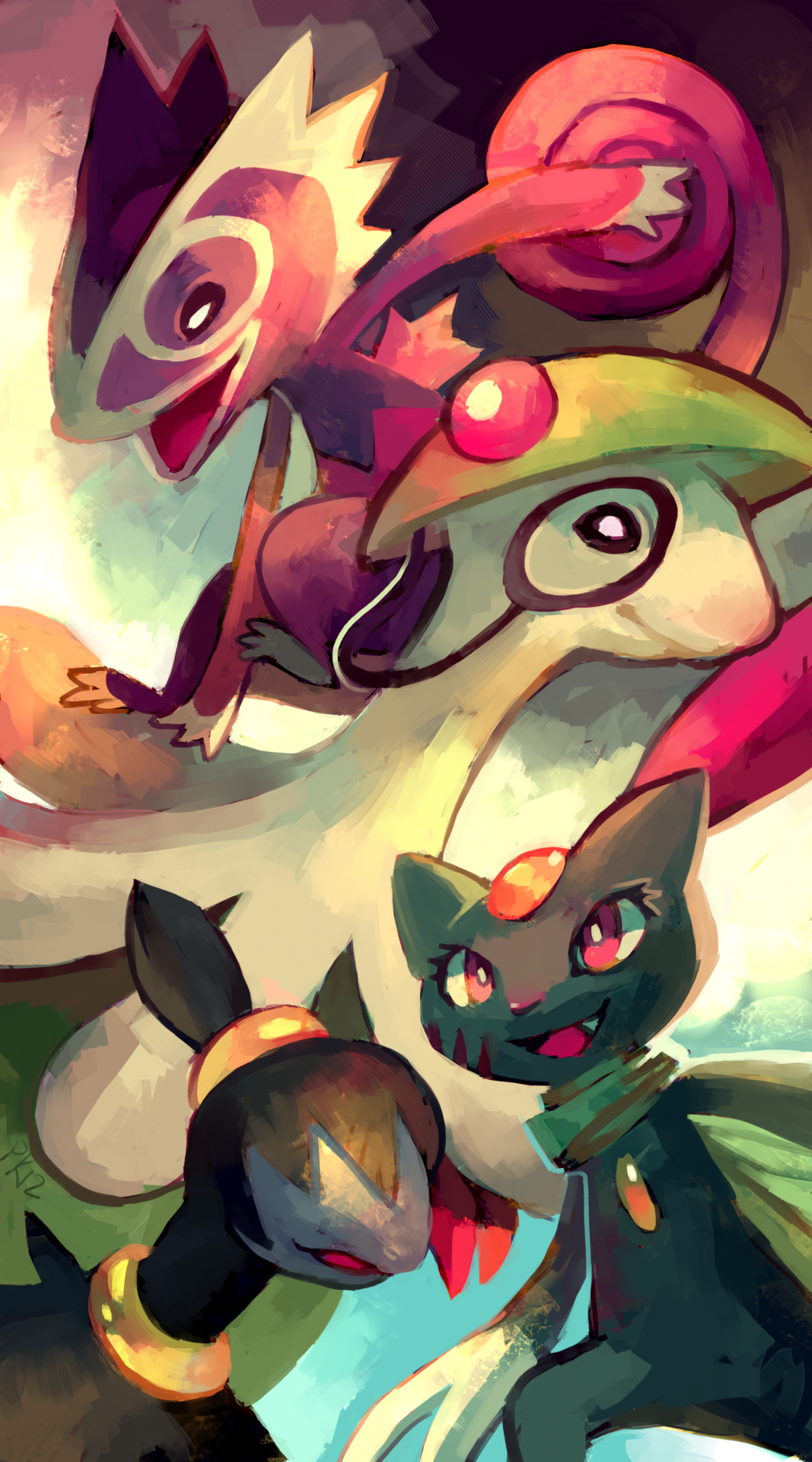 breloom cape commentary deino_(pokemon) eyelashes facial_mark fang gen_2_pokemon gen_3_pokemon gen_5_pokemon glitchedpuppet highres kecleon monocle nintendo no_humans pink_eyes pk_(pmd-explorers) pokemon pokemon_(creature) pokemon_mystery_dungeon sandy_(pmd-explorers) shroomsworth_(pmd-explorers) signature smile sneasel