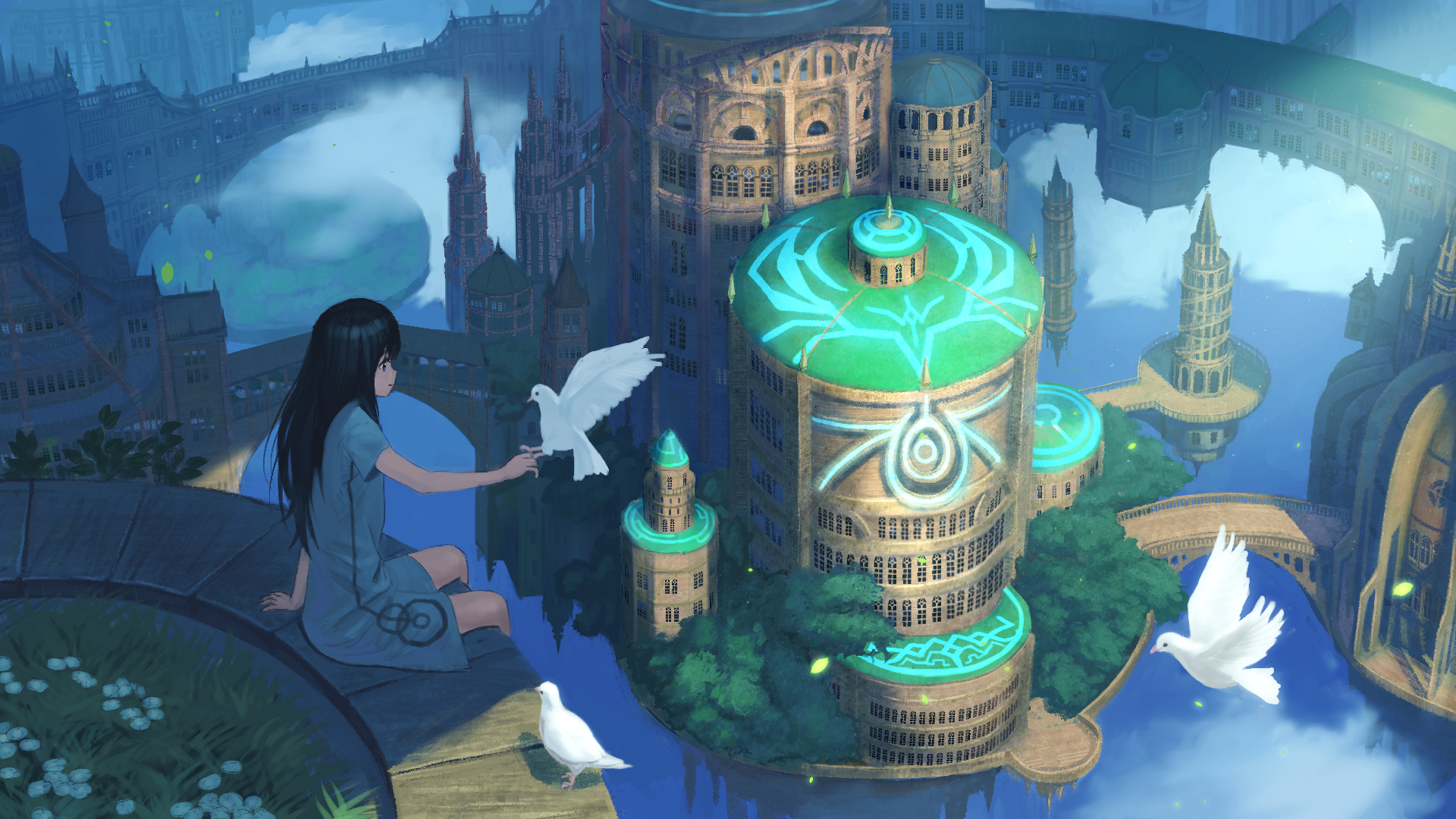 1girl animal arch_bridge arm_support bird bird_request black_hair blue_eyes bride bridge building closed_mouth cloud commentary_request dress female_focus floating_city floating_island flower highres light_smile original petals profile scenery short_sleeves sitting solo tower tree wasabi60 white_dress white_flower