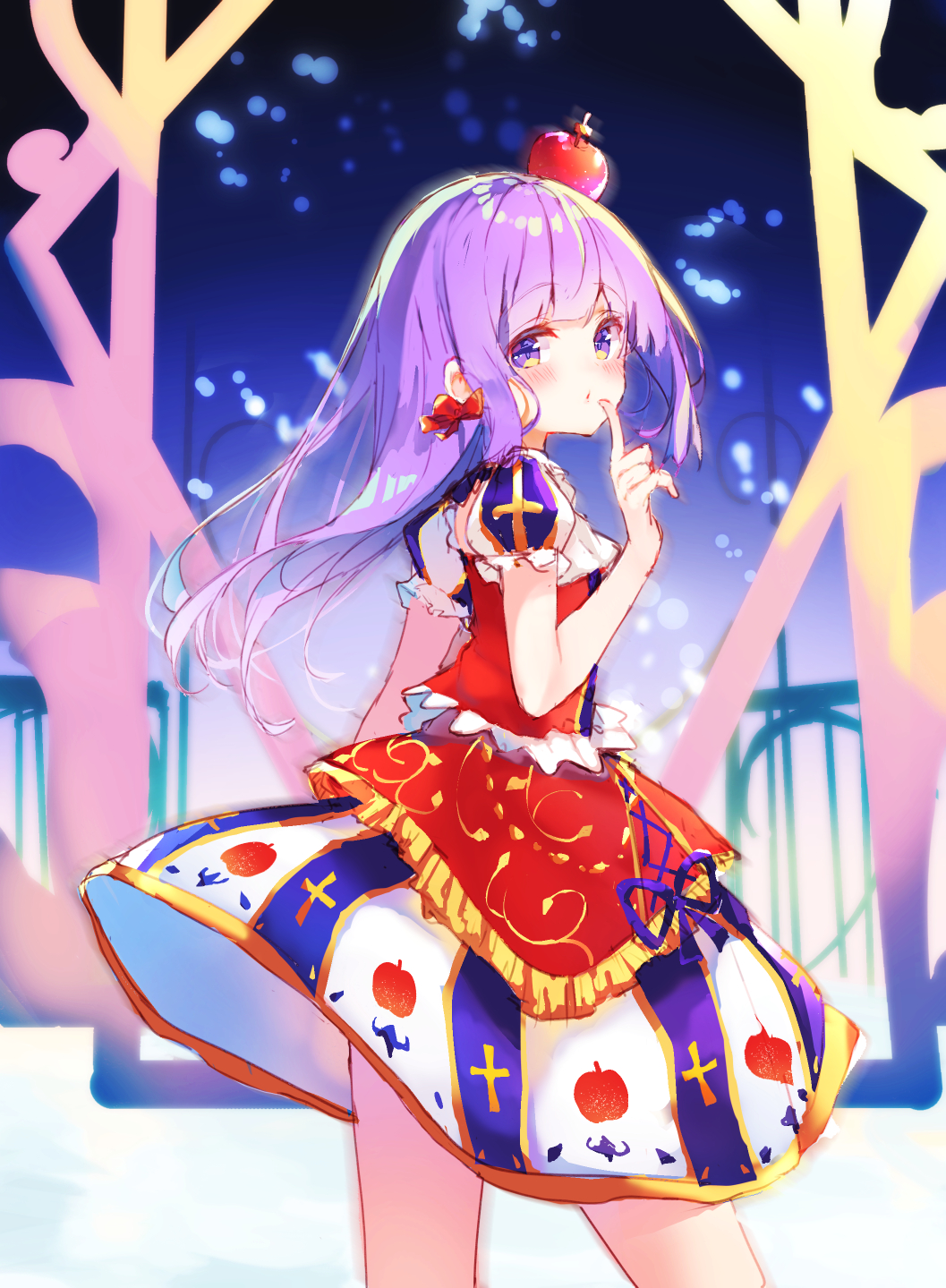 1girl :o aikatsu! aikatsu!_(series) apple apple_on_head apple_print blue_ribbon blush bow cross cross_print dress female_focus food food_on_head food_print fruit fruit_print hair_bow highres hikami_sumire index_finger_raised latin_cross long_hair looking_at_viewer looking_to_the_side makiaato multicolored_dress object_on_head parted_lips print_dress puffy_short_sleeves puffy_sleeves purple_eyes purple_hair red_bow ribbon short_sleeves solo very_long_hair