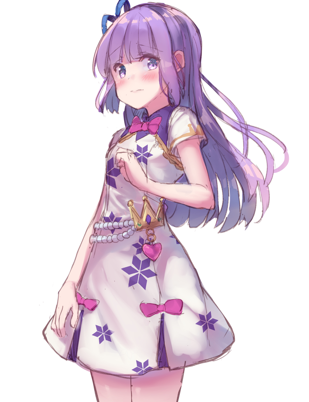 1girl aikatsu! aikatsu!_(series) bad_id blush bow breasts closed_mouth cowboy_shot dress female_focus heart highres hikami_sumire long_hair makiaato pink_bow pleated_dress purple_eyes purple_hair short_sleeves simple_background small_breasts solo very_long_hair white_background white_dress