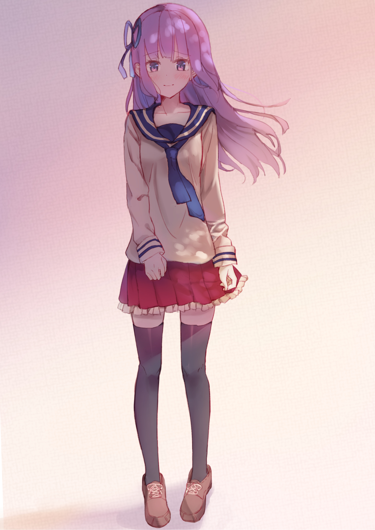 1girl aikatsu! aikatsu!_(series) black_thighhighs blue_neckwear blue_ribbon blue_sailor_collar brown_shoes female_focus full_body hair_ribbon highres hikami_sumire long_hair long_sleeves makiaato pleated_skirt purple_eyes purple_hair red_skirt ribbon sailor_collar school_uniform serafuku shirt shoes skirt solo standing thighhighs very_long_hair white_shirt