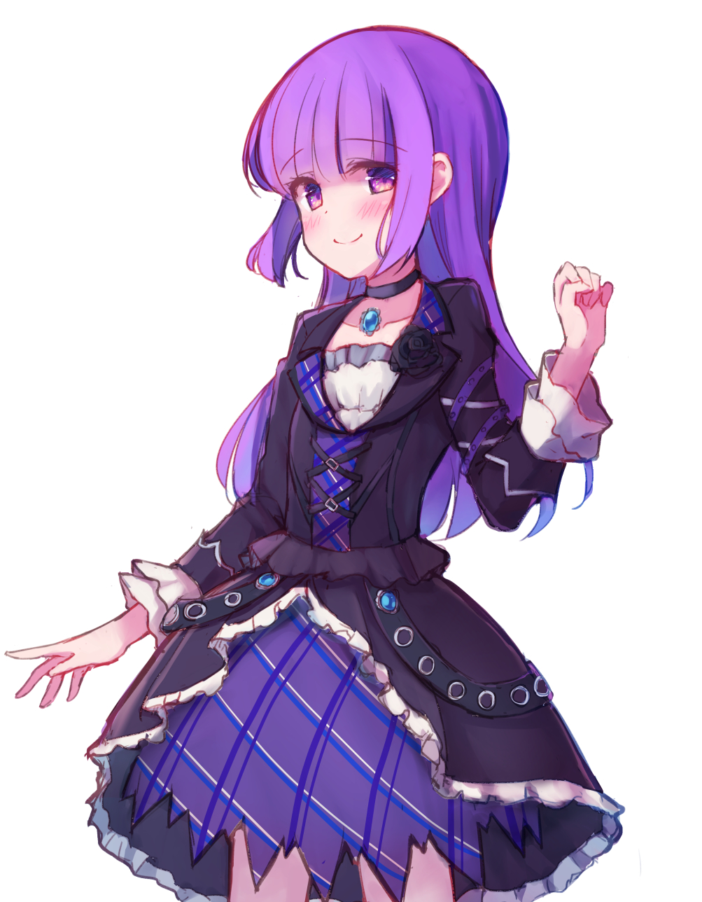 1girl aikatsu! aikatsu!_(series) black_choker black_dress black_flower black_rose blush choker closed_mouth collarbone cowboy_shot dress female_focus flower highres hikami_sumire long_hair long_sleeves looking_at_viewer makiaato plaid purple_eyes purple_hair rose simple_background smile solo very_long_hair white_background