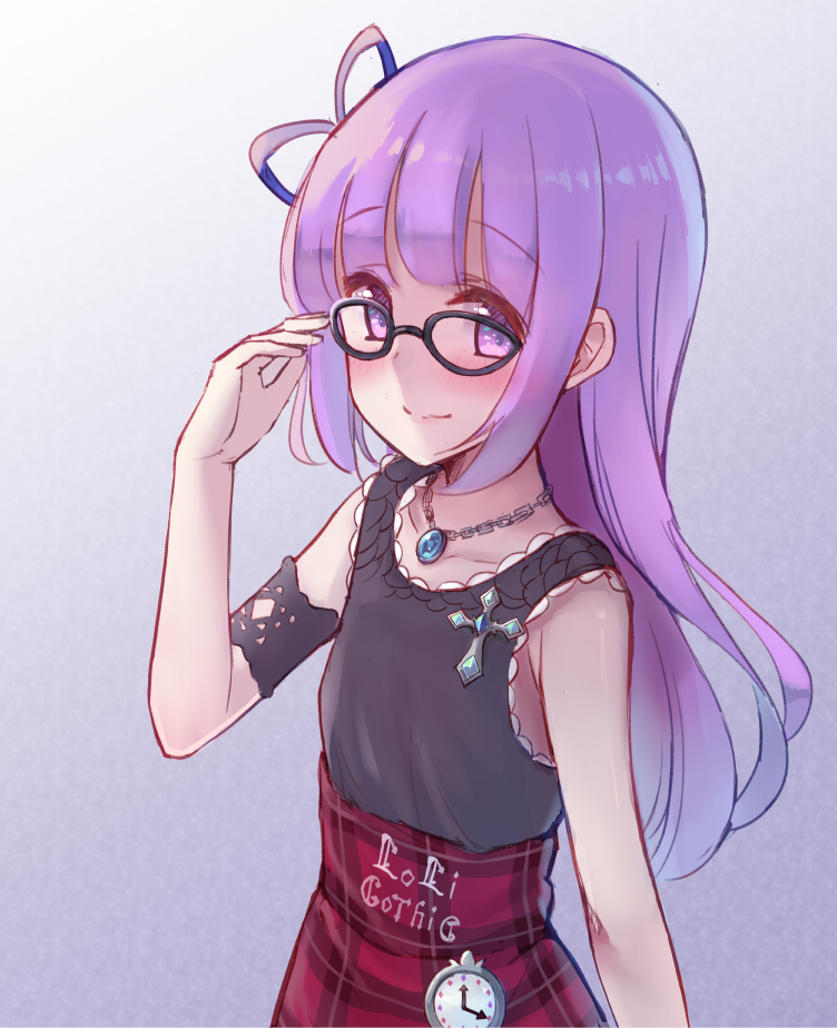 1girl adjusting_eyewear aikatsu! aikatsu!_(series) bare_shoulders bespectacled black-framed_eyewear black_shirt blue_ribbon blush clock closed_mouth clothes_writing collarbone female_focus glasses hair_ribbon hand_on_eyewear hikami_sumire long_hair looking_at_viewer makiaato plaid_clothes plaid_skirt purple_eyes purple_hair red_skirt ribbon shirt skirt sleeveless sleeveless_shirt smile solo very_long_hair