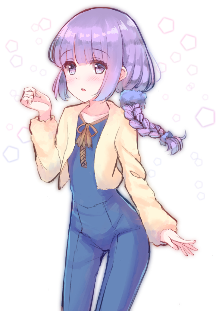 1girl aikatsu! aikatsu!_(series) blue_jumpsuit blush braid female_focus hikami_sumire jacket jumpsuit long_hair long_sleeves looking_at_viewer makiaato open_clothes open_jacket parted_lips purple_eyes purple_hair side_ponytail sleeves_past_wrists solo white_background yellow_jacket