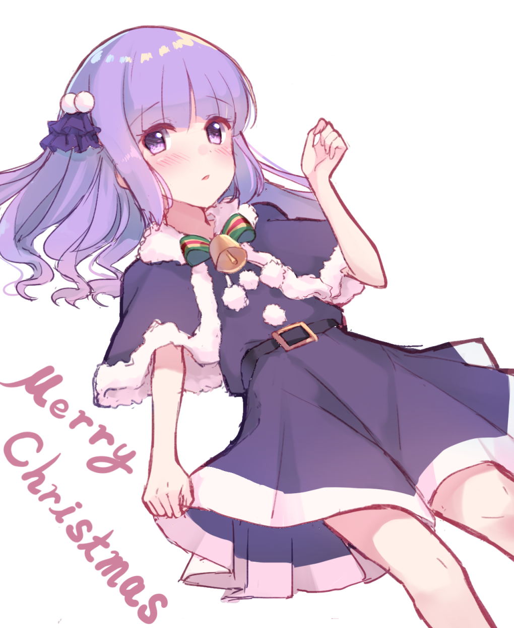 1girl aikatsu! aikatsu!_(series) belt belt_buckle black_belt black_santa_costume blush buckle capelet dress female_focus fur-trimmed_capelet fur_trim hair_ribbon highres hikami_sumire long_hair looking_at_viewer lying makiaato merry_christmas on_back parted_lips pom_pom_(clothes) purple_capelet purple_dress purple_eyes purple_hair purple_ribbon ribbon santa_costume simple_background solo white_background