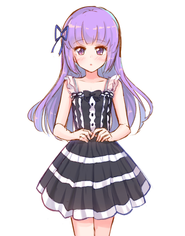 1girl :o aikatsu! aikatsu!_(series) bare_arms bare_shoulders black_dress blue_ribbon blush cowboy_shot dress female_focus hair_ribbon hikami_sumire looking_at_viewer makiaato parted_lips purple_eyes purple_hair ribbon simple_background sketch sleeveless sleeveless_dress solo white_background
