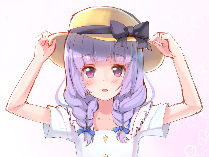 1girl aikatsu! aikatsu!_(series) arms_up black_bow black_ribbon blue_ribbon blush bow braid female_focus hair_ribbon hands_on_headwear hat hat_bow hat_ribbon hikami_sumire long_hair looking_at_viewer low_twintails makiaato parted_lips purple_eyes purple_hair ribbon shirt short_sleeves solo sun_hat twin_braids twintails white_shirt
