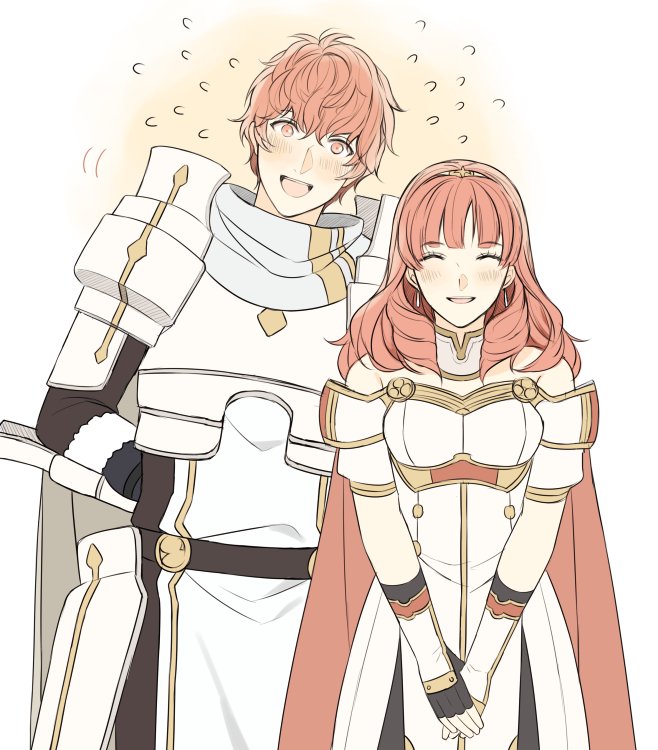 1girl armor aym_(ash3ash3ash) brother_and_sister cape celica_(fire_emblem) dress earrings fingerless_gloves fire_emblem fire_emblem_echoes:_shadows_of_valentia gloves jewelry long_hair looking_at_viewer nintendo open_mouth red_armor red_eyes red_hair siblings smile tiara white_armor