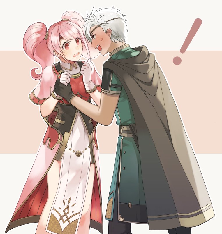 1boy aym_(ash3ash3ash) bad_id bad_twitter_id blush boey_(fire_emblem) brown_eyes cape circlet dark-skinned_male dark_skin fire_emblem fire_emblem_echoes:_shadows_of_valentia gloves long_hair mae_(fire_emblem) nintendo open_mouth pink_hair red_eyes simple_background twintails white_hair