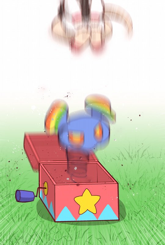 10s 1girl anteater_tail box cellien_(kemono_friends) chibi female_focus grass jack-in-the-box jumping kemono_friends kemono_friends_pavilion motion_blur open_box playground_equipment_(kemono_friends_pavilion) silky_anteater_(kemono_friends) solo spring_(object) star_(symbol) tanaka_kusao