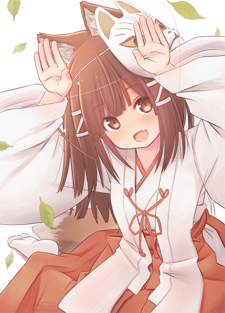 1girl :d animal_ears arms_up blush brown_eyes brown_hair fang female_focus fox_mask fujisaki_yuu hair_ribbon hakama hakama_skirt head_tilt japanese_clothes leaf long_sleeves looking_at_viewer mask mask_on_head miko no_shoes open_mouth original rabbit_pose red_hakama ribbon simple_background sitting skirt smile socks soles solo tabi tail white_background white_ribbon white_socks wide_sleeves
