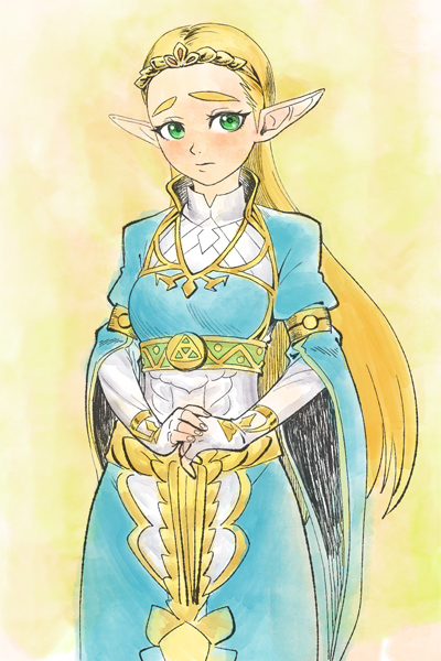 1girl blonde_hair breasts closed_mouth dress elbow_gloves eyelashes female_focus fingerless_gloves forehead gloves green_eyes long_hair long_sleeves looking_at_viewer medium_breasts multicolored_dress natto_soup nintendo pointy_ears princess_zelda puffy_long_sleeves puffy_sleeves solo standing straight_hair the_legend_of_zelda the_legend_of_zelda:_breath_of_the_wild thick_eyebrows tiara triforce turtleneck white_gloves