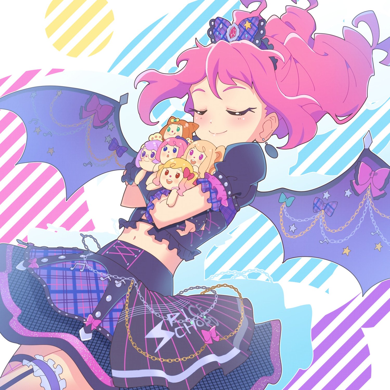 10s 1girl aikatsu!_(series) aikatsu_stars! alternate_costume blush character_doll closed_eyes doll female_focus hair_ornament highres idol kasumi_mahiru midriff nanakura_koharu navel nijino_yume pink_hair sakuraba_rola saotome_ako skirt smile solo thighhighs wings yuniwo