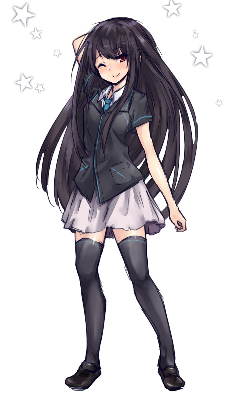 1girl amagi_(amagi626) arm_behind_head black_footwear black_hair black_shirt black_thighhighs blue_necktie blush commentary convenience_store familymart female_focus full_body highres houraisan_kaguya long_hair looking_at_viewer miniskirt necktie one-hour_drawing_challenge one_eye_closed pleated_skirt pocket red_eyes shirt shop short_sleeves skirt smile solo star_(symbol) thighhighs touhou white_skirt zettai_ryouiki