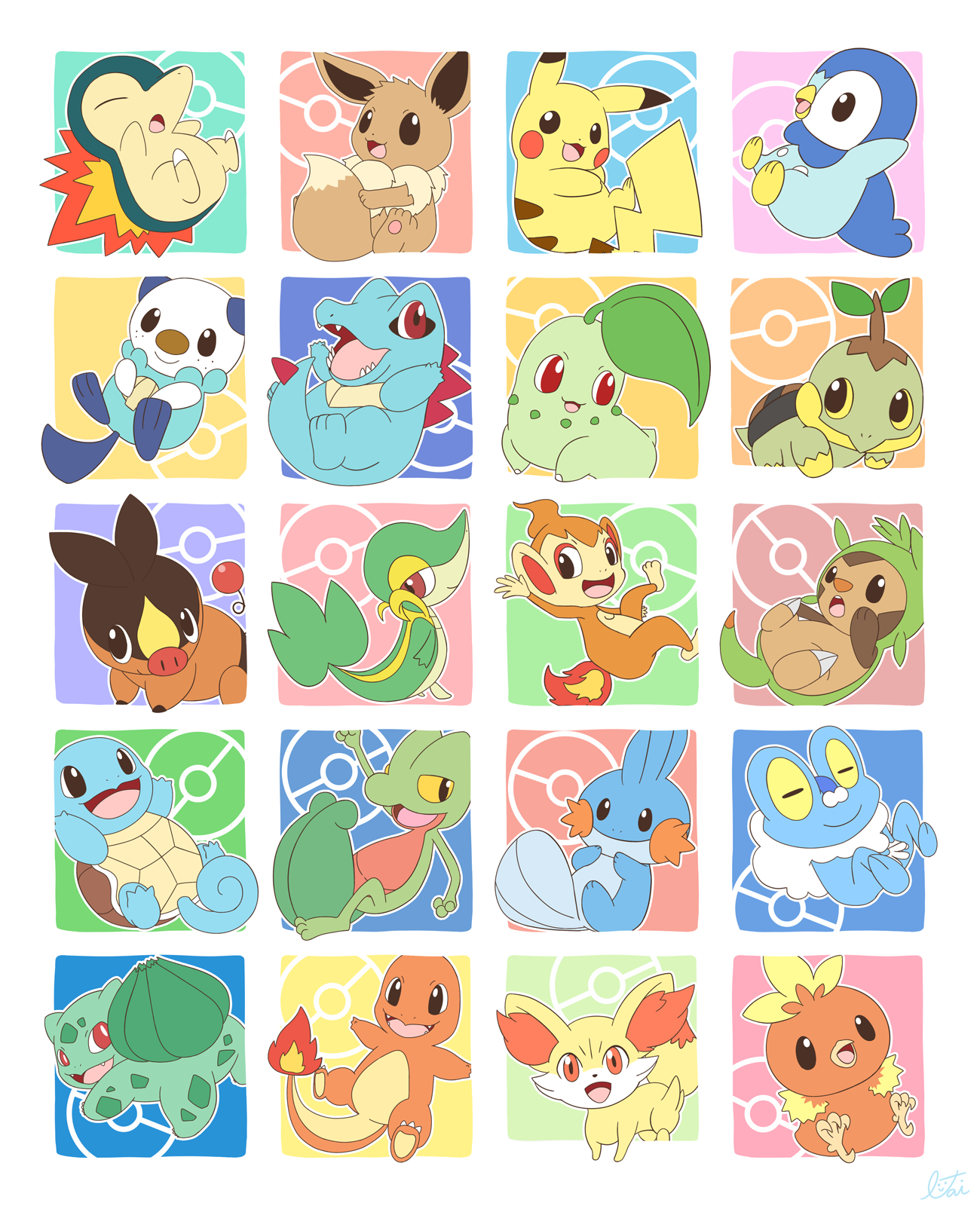 :d bird black_eyes blush_stickers brown_eyes bulbasaur charmander chespin chikorita chimchar closed_mouth commentary commentary_request creature cyndaquil eevee fennekin fiery_tail fire flame-tipped_tail froakie gen_1_pokemon gen_2_pokemon gen_3_pokemon gen_4_pokemon gen_5_pokemon gen_6_pokemon happy highres lai_(pixiv1814979) looking_at_viewer mudkip multicolored_background nintendo no_humans open_mouth orange_eyes oshawott pikachu piplup pokemon pokemon_(creature) red_eyes sharp_teeth smile snivy squirtle starter_pokemon_trio tail teeth tepig torchic totodile treecko turtwig waving yellow_eyes