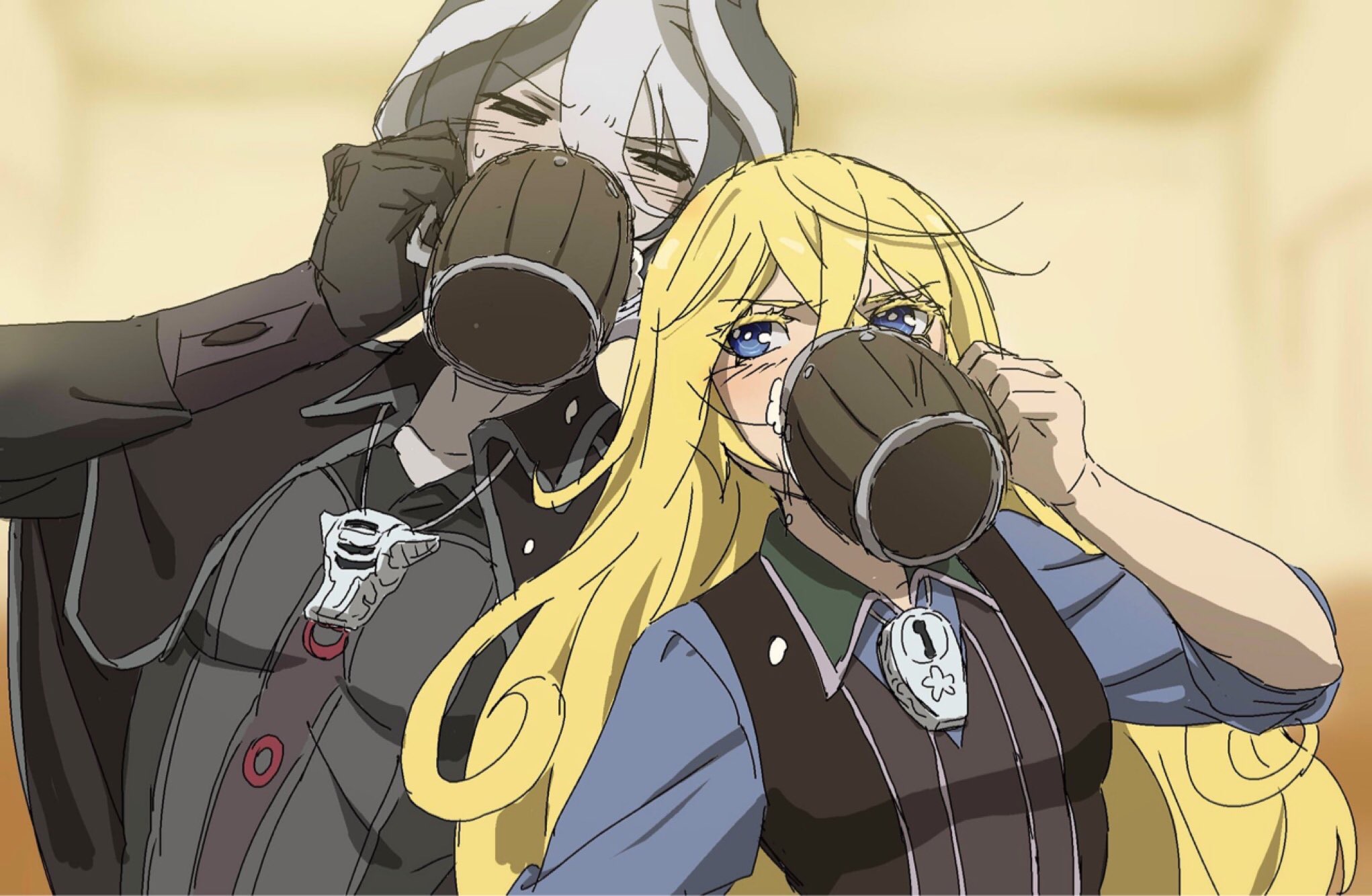 2girls black_cape black_gloves black_hair black_jacket blonde_hair blurry blurry_background blush cape commentary_request cup depth_of_field drinking drunk gloves grey_hair hair_between_eyes highres holding jacket long_hair long_sleeves looking_at_another lyza_(made_in_abyss) made_in_abyss mi_(pic52pic) mug multiple_girls ozen short_hair sweatdrop upper_body whistle