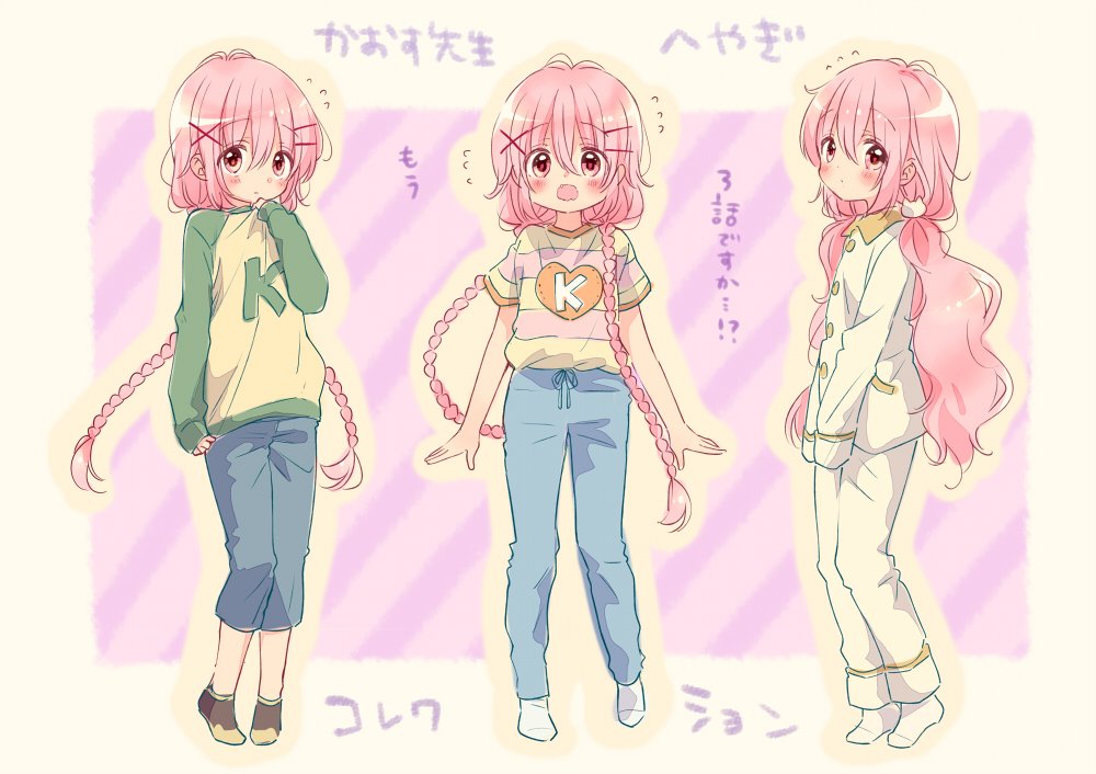 10s 1girl alternate_costume alternate_hairstyle blouse blush braid casual comic_girls fang hair_ornament hairclip hanzawa_kaori long_hair looking_at_viewer low_twintails moeta_kaoruko multiple_views open_mouth pajamas pants pink_hair shirt striped_clothes striped_shirt translation_request twin_braids twintails