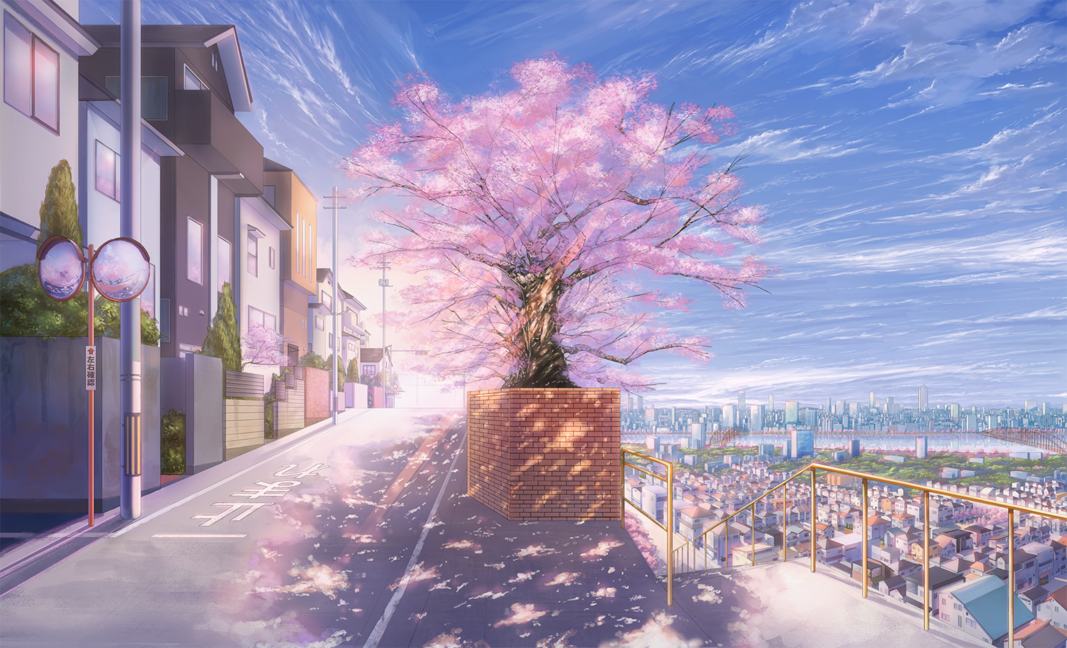 bridge building cherry_blossoms cityscape cloud commentary house kagumanikusu mirror no_humans original railing river road scenery sky spring_(season) stairs street sunlight sunrise tree vanishing_point