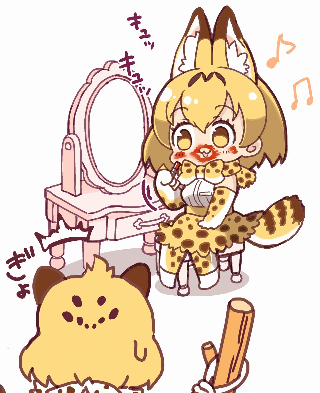 10s 2girls :3 :d ^^^ animal_ears animal_print blonde_hair blush bow bowtie cosmetics derivative_work elbow_gloves failure gloves high-waist_skirt highres jaguar_(kemono_friends) jaguar_ears kemono_friends kemono_friends_pavilion lipstick lipstick_tube makeup mirror multiple_girls musical_note open_mouth orange_neckwear serval_(kemono_friends) serval_tail shirt short_hair sitting skirt sleeveless sleeveless_shirt smile sweatdrop table tail tanaka_kusao thighhighs two-tone_bow two-tone_bowtie vanity_table yellow_eyes yellow_gloves yellow_skirt